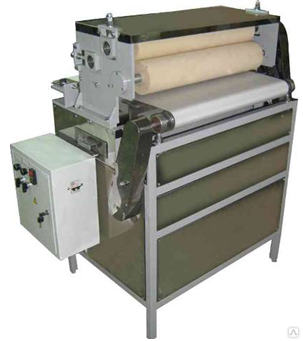 Машина для намазки сахарного печенья представляет собой конвейерную ленту шириной 62 см. с установленными над ней специальными валами. Они, захватывая жидкость из бункера, покрывают ею кондитерские изделия. Регулирование скорости вращения валов, движения ленты от 0,2 до 4 метров в минуту позволяет адаптировать оборудование под выпуск различной продукции.