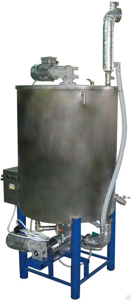 А поддерживает температуру внутри емкости водяная рубашка, оснащенная сливным краном (расположен снизу). Там же размещен и патрубок слива продукта.